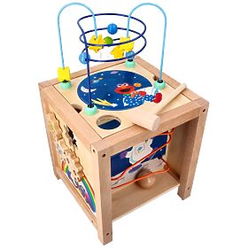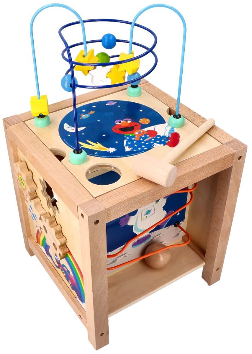 - The final side, located at the top of the cube, is a classic motor loop consisting of 2 rods. One rod is bent into a parabola shape, the other into a spiral. On the rods are colorful wooden beads in the shape of balls and stars. Next to the loop is a hole through which a ball must be hammered to slide down the slide, which is an attraction of the side panel. The overall look of the top side is completed by a beautiful cosmic-themed picture and the friendly character of Elmo hugging his favorite teddy bear.