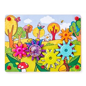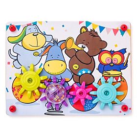 The gears are quite large and turn slowly. Find out what the animals will be doing today. Will they ride a train or fly a rocket, play on the playground or perform in the circus? You can also store the gears on a wooden base and invent your own stories.