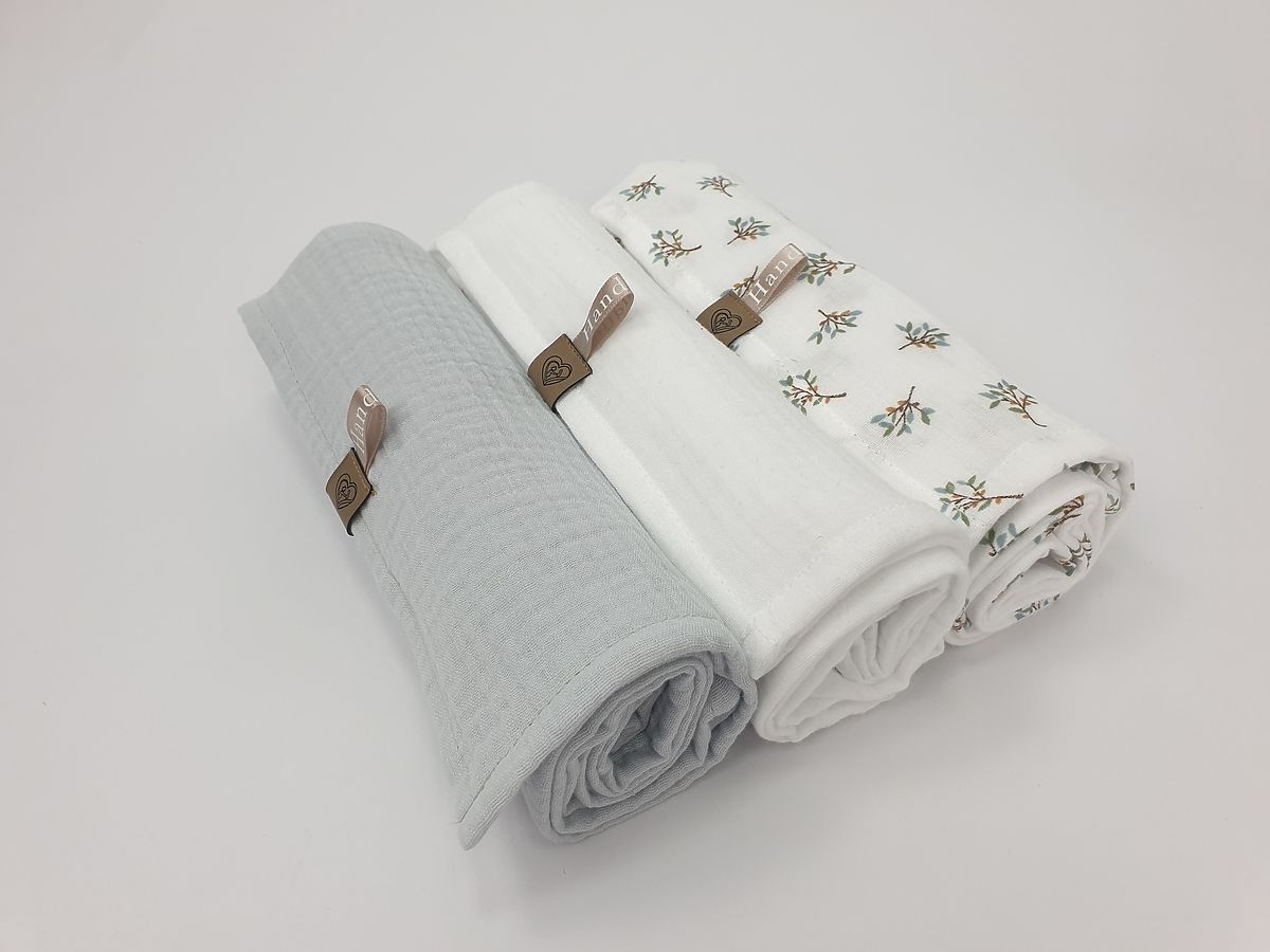This set of three muslin diapers is the perfect addition to any kit. Diapers have many uses. They are ideal helpers when feeding babies. By placing the baby's head on the diaper in the crib, stroller or car seat, you ensure a peaceful and pleasant sleep.