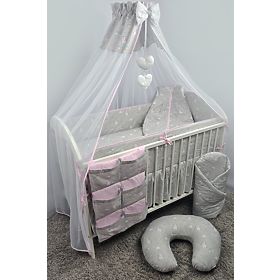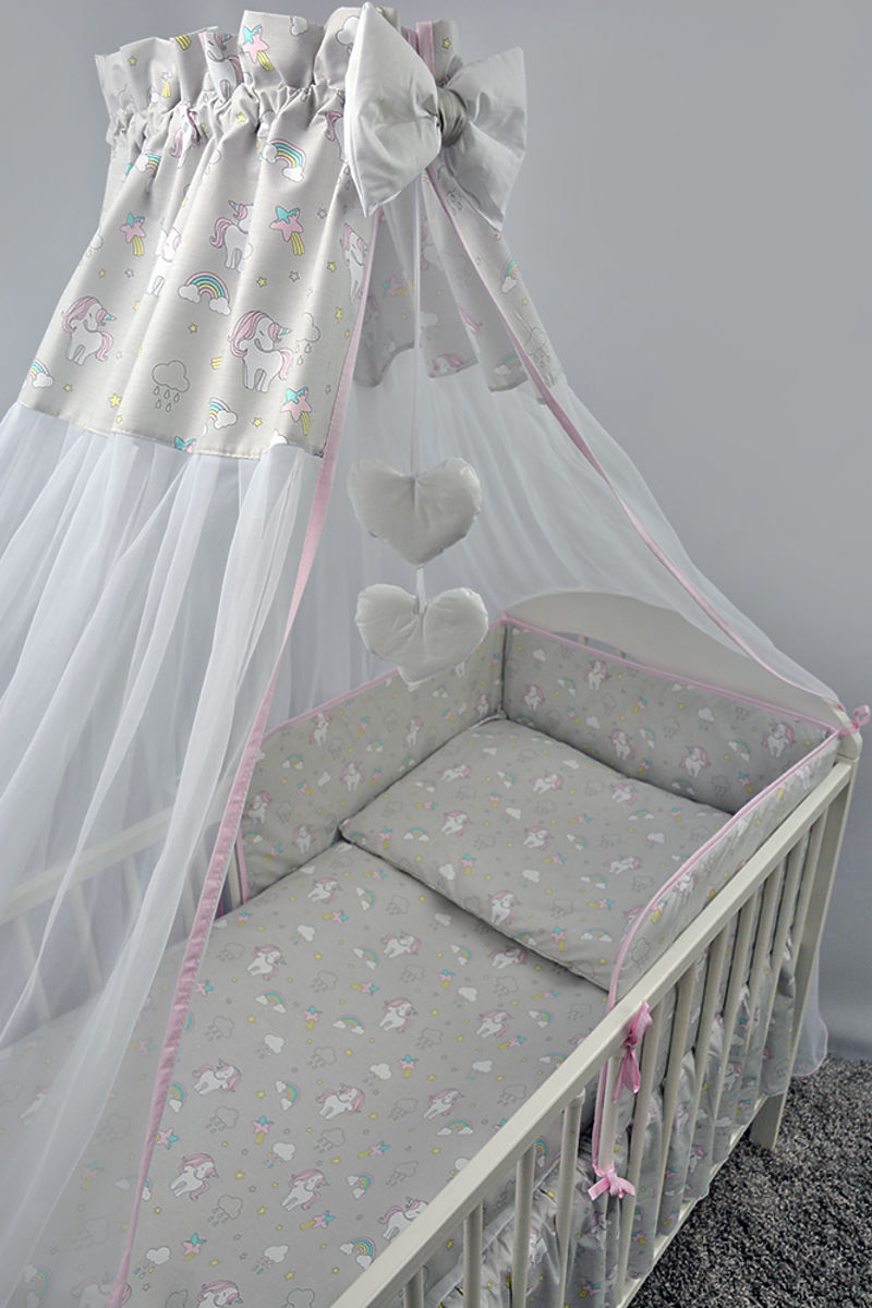 A beautiful universal canopy above a baby crib with a favorite pony theme. The combination of gray, pink and white has a very pleasant and graceful appearance.