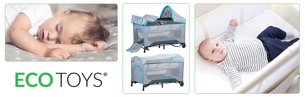 The travel folding cot is suitable for children from the first days of life. The cot has a hanging bed for infants, a mosquito net and a changing table, interactive toys and a portable bag are also included.