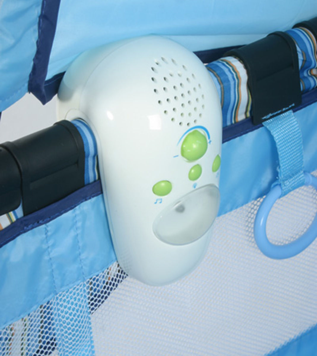 Its base can be positioned on two levels. The upper level offers a weight capacity of 15 kg, lower level 20 kg. It comes with a night light and a music feature with adjustable volume.