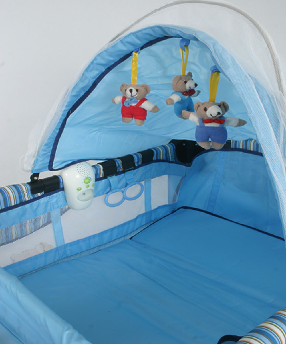 The cot has a hood with toys, which attracts children's attention. It comes with a mosquito net, which protects children from insects and there is a side pocket for accessories and essentials. To allow children to comfortably get out of the cot, there is a zipped opening on one side.