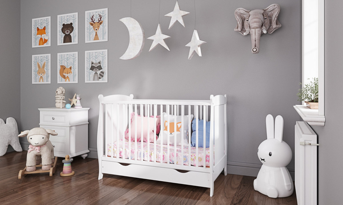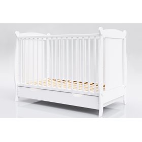 Beautiful Laura baby cot in classic white color. The cot is designed in a classic style. Option to purchase a version with a drawer, providing a practical space for diapers, toys, and other necessities.