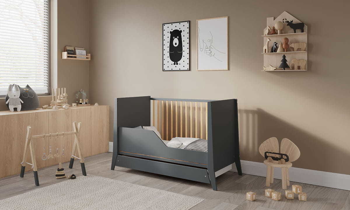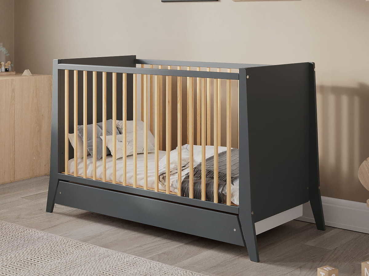 Original model of the Cosmo baby crib in dark gray color with natural slats in a modern design. Standard size 120x60 cm available with or without storage space. Suitable for children from birth up to a height of 100 cm.