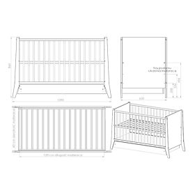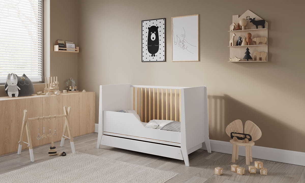 The beautiful Cosmo Scandi baby crib in a white-natural decor with dimensions of 120x60 cm features a modern design and is available with or without storage space. The crib is suitable for children from birth up to a height of 100 cm.