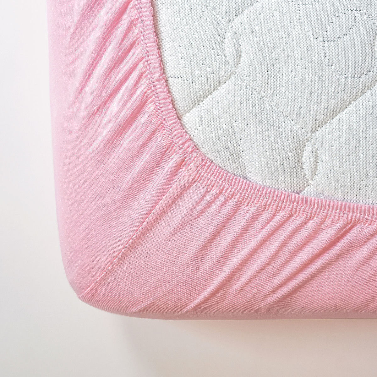 Cotton bed sheet in pink color . The sheet is woven from high-quality cotton yarns , which is why it retains its properties even after repeated washing.