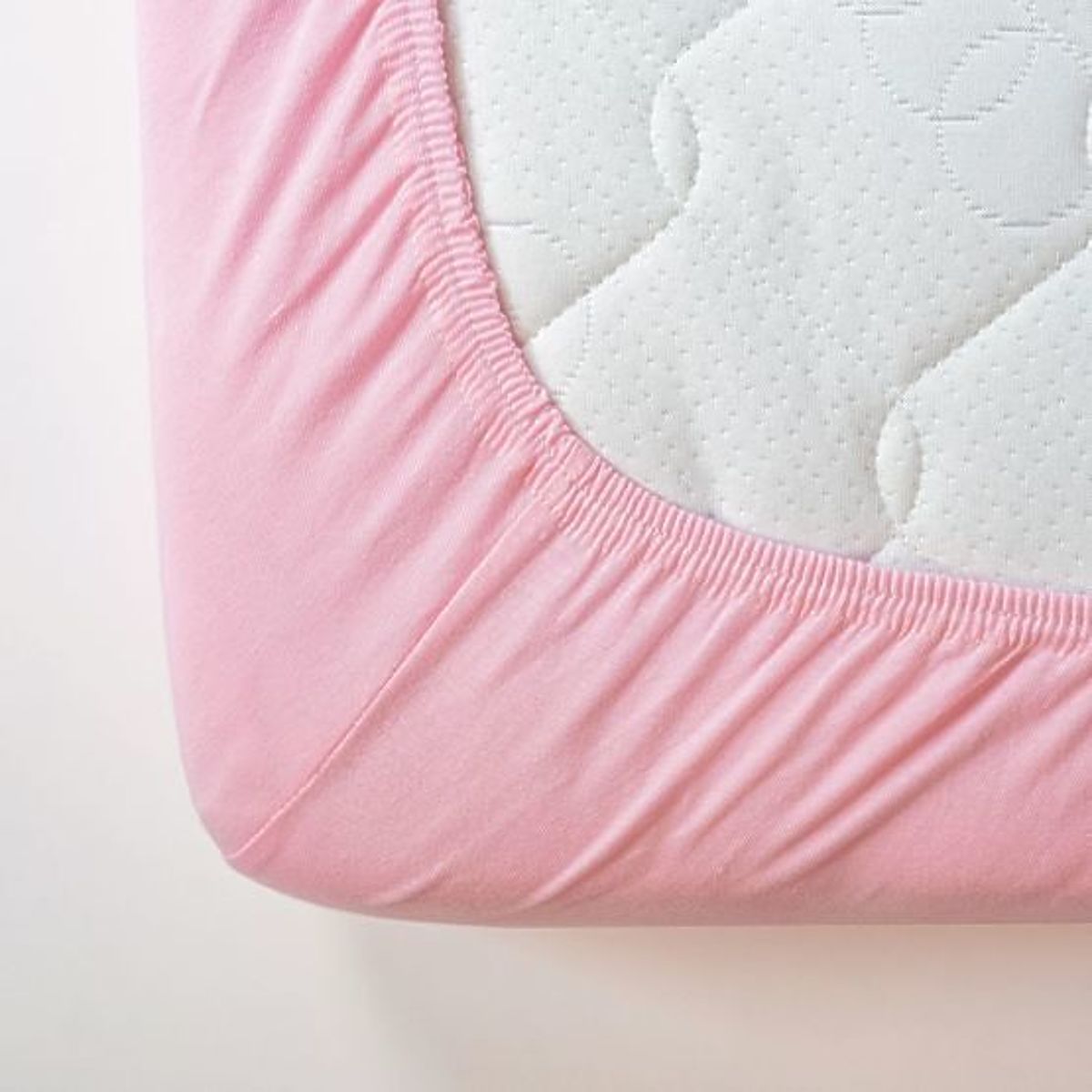 Soft pink cotton fitted sheet with sewn-in elastic for a snug fit. .. more