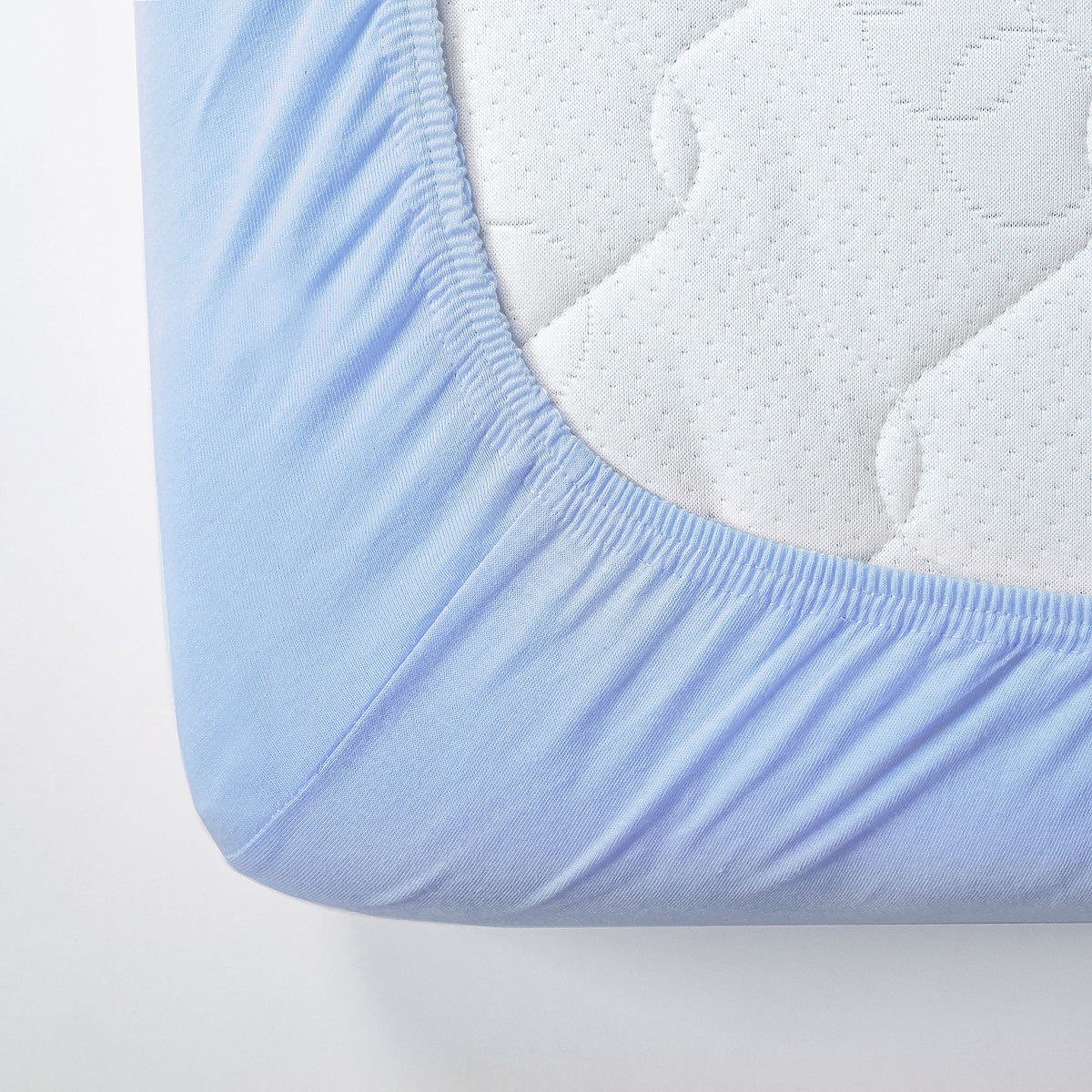 Cotton fitted sheet in light blue color . The sheet is woven from high-quality cotton yarns , which is why it retains its properties even after repeated washing.