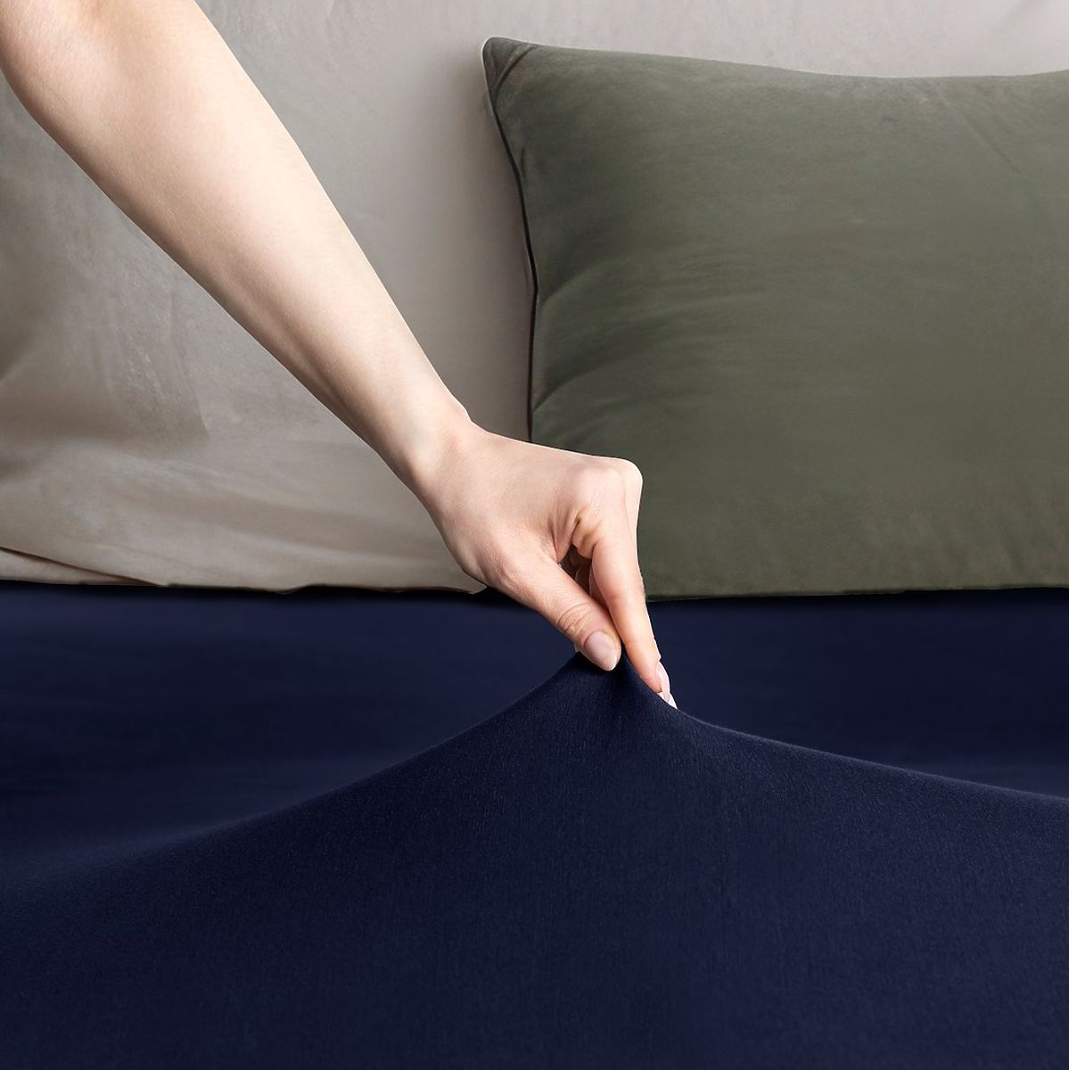 Navy blue fitted sheet in classic style, made from jersey material. .. more