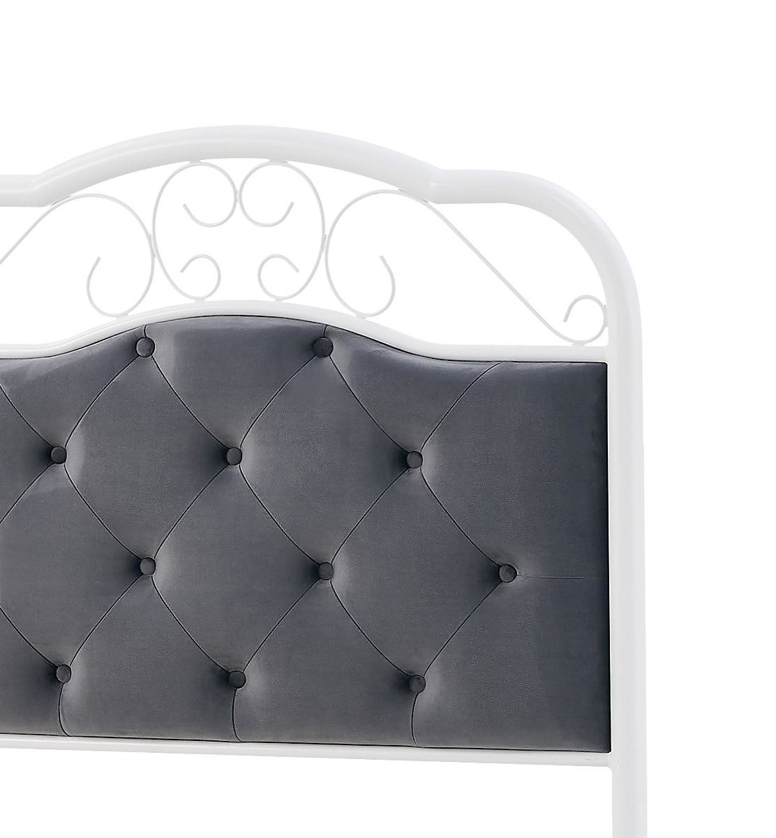The entire structure of the bed is made of painted steel in white color, which gives the bed a light and airy appearance. White color tends to visually expand the space and create an impression of cleanliness and freshness. The steel structure is durable and strong , which ensures the stability and longevity of the bed. The most distinctive element of the bed is the upholstered headboard , which is covered with gray velvet fabric . This fabric part has fine decorative stitching that adds elegance and charm to the bed.