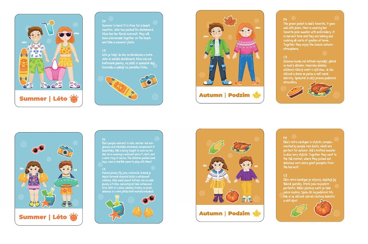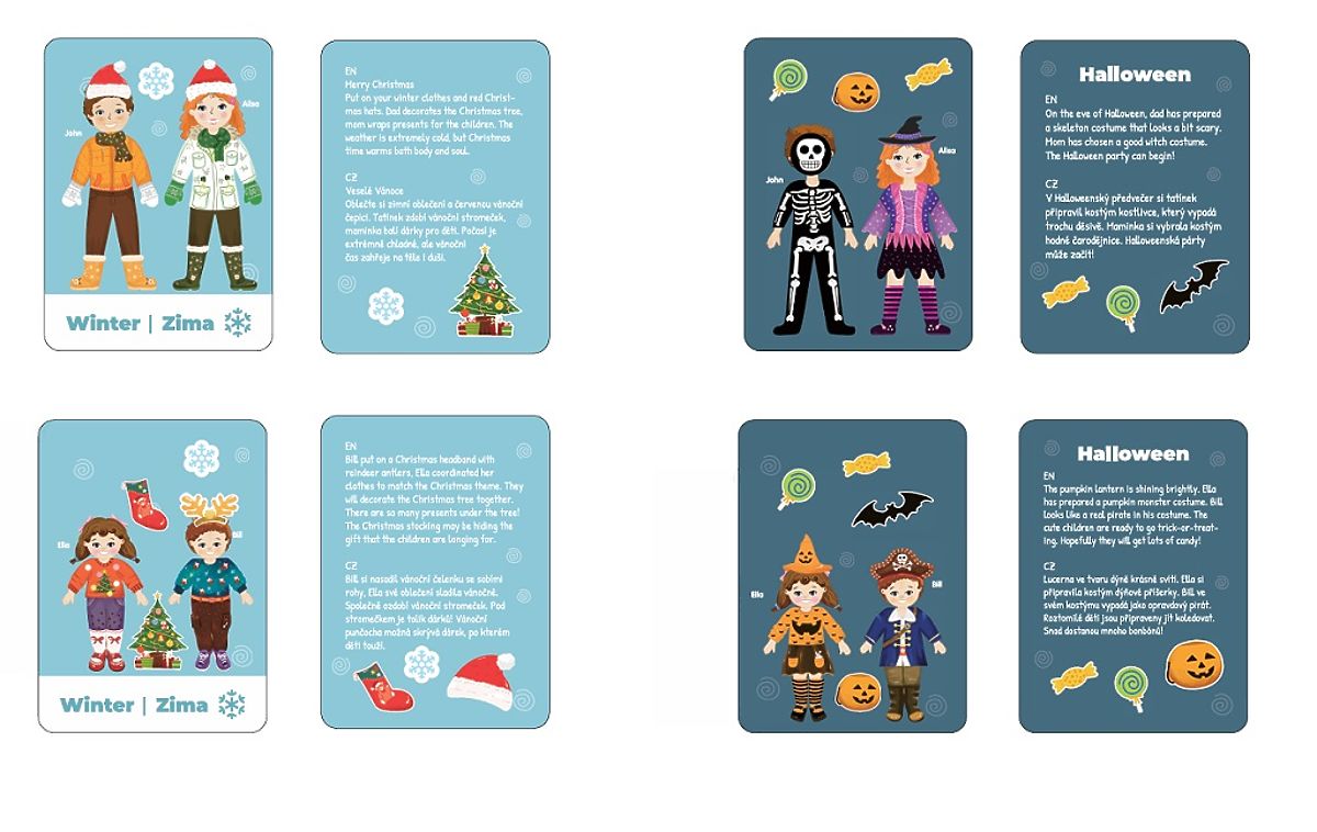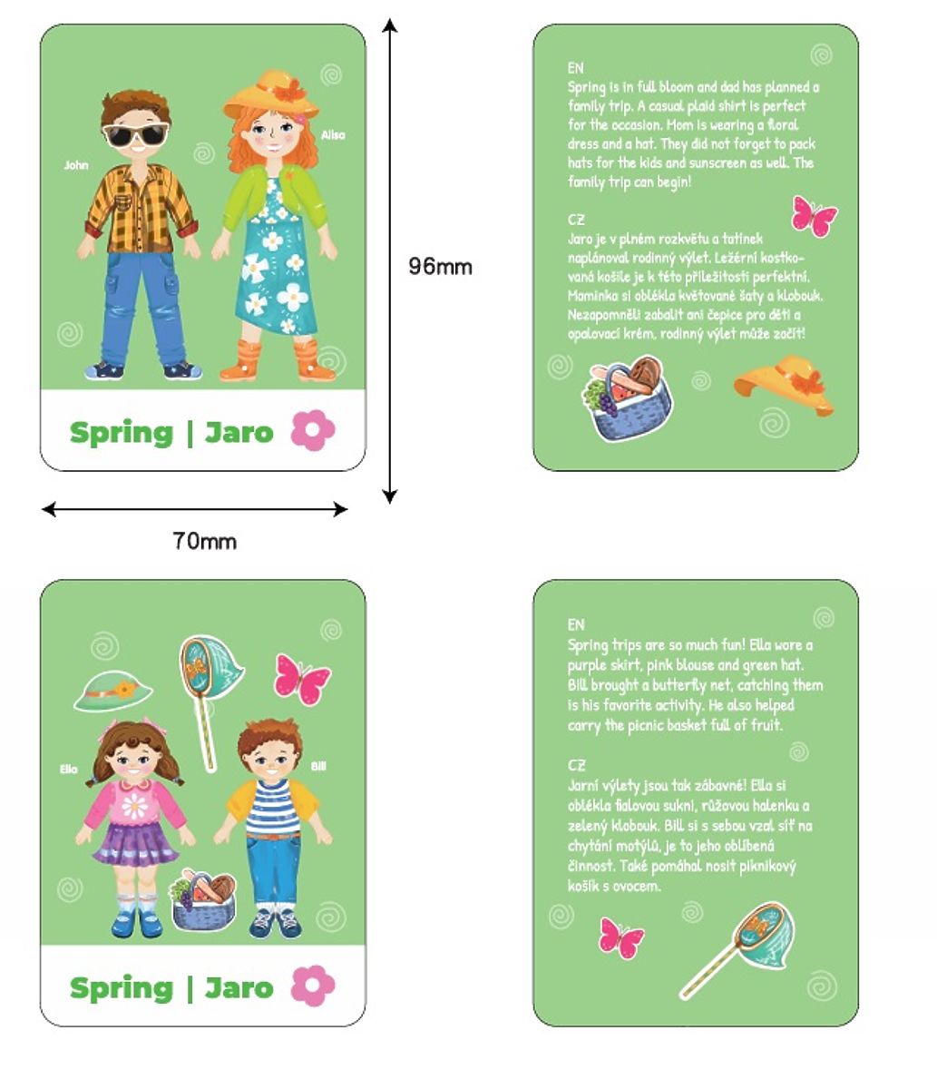 Dress the whole family according to the season, mood, or a fun task! The "Happy Family" magnetic set offers plenty of creative fun in designing outfits for mom, dad, the little girl, and the little boy. Each family member has their own magnetic clothes, accessories, and unique style – it's up to the child's imagination how to dress them. The set also includes themed cards that inspire children with specific tasks – such as summer or autumn clothing, a trip to the beach, baking a pumpkin pie, or autumn harvest and winter fun. Children playfully learn about the seasons, develop imagination, and practice fine motor skills. Main features: wooden magnetic box with a rotating board, 4 characters to dress (mom, dad, daughter, son), more than 80 magnetic pieces of clothing and accessories, 8 double-sided story cards in Czech and English (spring, summer, etc.), develops fine motor skills, imagination, and understanding of the seasons, suitable for children from 3 years, perfect for play at home or on the go.