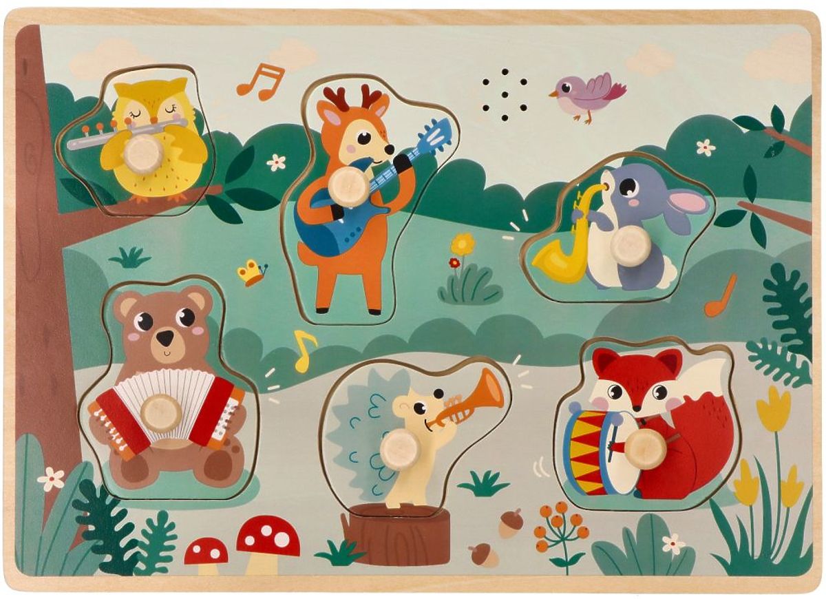 Another sound offering from Adam Toys alongside the farm and safari puzzles. This time, we not only get to know forest animals but also the sounds of various instruments. The task is, of course, to match the shape of the animal to the correct place on the puzzle. If done correctly, the reward is the sound of the instrument each animal plays. This educational toy excellently develops children's imagination, teaches concentration and observational skills. It also helps children practice manual skills, especially their fingers, and the sound further encourages play.