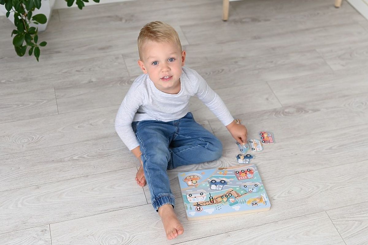Another musical puzzle? You can never have too many! This time, it's a sound puzzle by Adam Toys, another offering from this company - alongside puzzles with themes of farm, safari, or tools. This time, we meet our forest friends driving various vehicles. The task is, of course, to match the shape of the animal to the correct spot on the puzzle. If the child does it correctly, they will hear the sound of the machine as a reward, in which the animal is located, e.g., a fox as a train driver, a raccoon pilot, or a bear firefighter :)