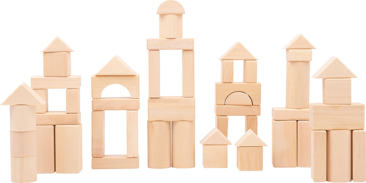 This set contains a large selection of wooden shaped blocks for building architectural masterpieces. Soft, rounded edges prevent injuries during play. Who will build the tallest tower?