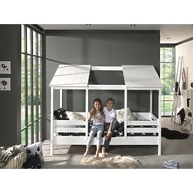 Create a dream room for your little ones with the white Malia bed featuring a roof and guardrail from the Housebed collection. The house-shaped bed provides a cozy play corner during the day and a safe sleeping space at night.