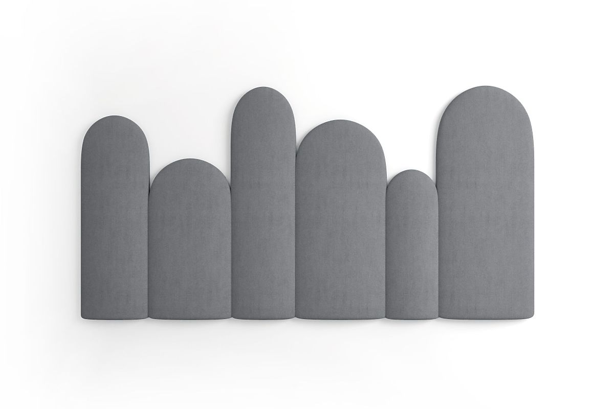 Set of Upholstered Panels is an original solution to enliven a child's room or bedroom. Includes 6 modules with a rounded top edge reminiscent of a fence, which can be freely combined to create your own wall arrangement. The panels are made with an emphasis on quality, safety, and comfort. The grey design appears universal and easily combines with other furniture and accessories.