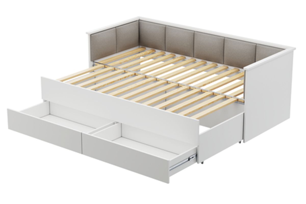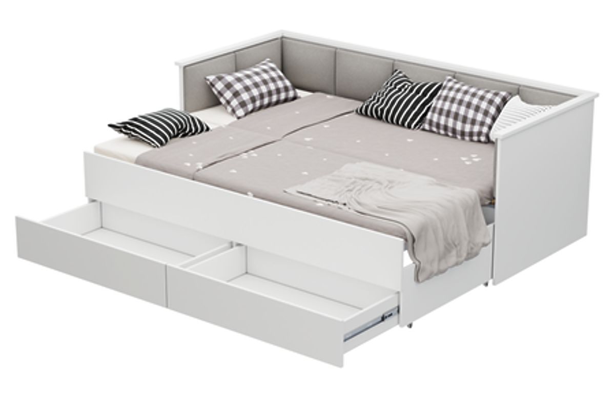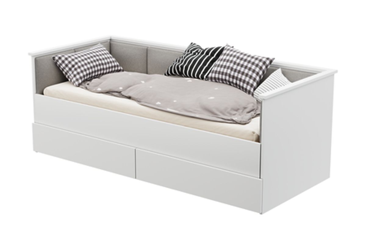 Convertible youth bed HELIOS with grey upholstered panels and spacious drawers. .. more