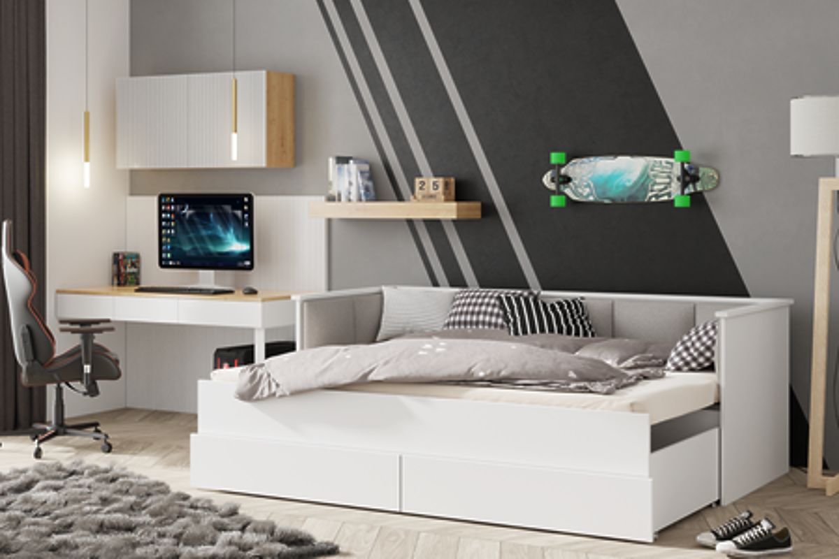 The minimalist design of the HELIOS bed, enriched with upholstered panels made of high-quality velvet material, gives the interior a modern and elegant character. The panels are not only an aesthetic addition but also a practical element that provides comfortable support while reading, watching TV, or studying. The soft and pleasant-to-touch material adds warmth and coziness, enhancing the friendly character of a youth room. Additionally, the bed is equipped with two spacious drawers on ball-bearing slides, allowing for the storage of bedding, clothes, or other small items. This solution not only helps maintain order but also optimally utilizes space, which is especially important in smaller rooms.