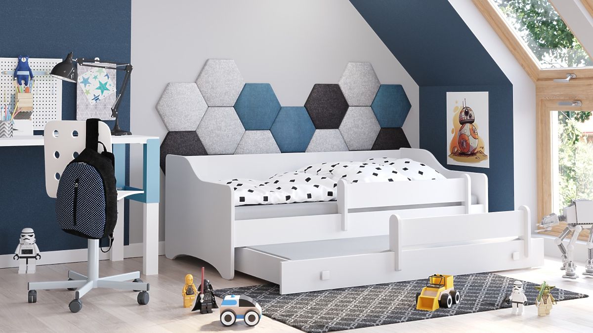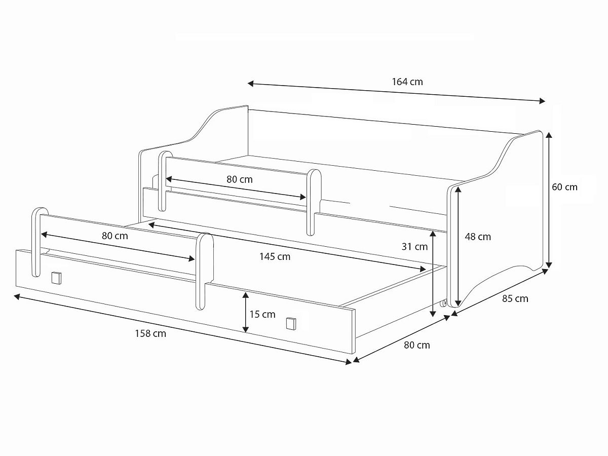 The Eryk bed is a functional and stylish solution for every boy. With two sleeping areas, the upper one measuring 160x80 cm and the lower one 145x80 cm, it is ideal for a room where space is at a premium. Its elegant design and durable materials ensure not only aesthetics but also safety and comfort for many years of use. It is an excellent choice for parents who want to create a comfortable and safe sleeping place for their child.