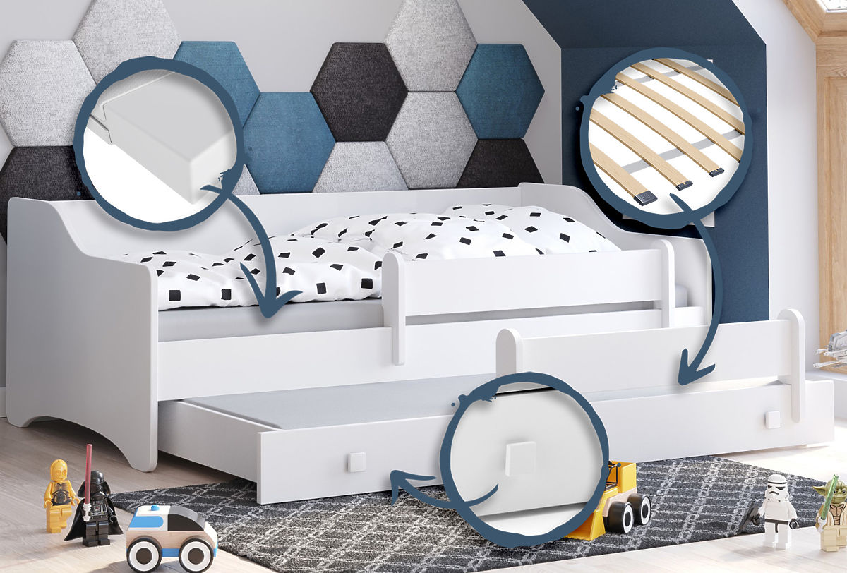 Thanks to its sturdy construction and durable materials, the Eryk bed guarantees stability and longevity. Rounded edges and a movable protective guardrail ensure that the child is safe during sleep, and the FLEX slatted base with spring slats provides comfort and proper support. The lower sleeping area, although not intended for storage, is an ideal solution for comfortable sleeping for siblings or friends who can spend time together. The Eryk bed is a combination of elegance, practicality, and safety that will serve for many years.