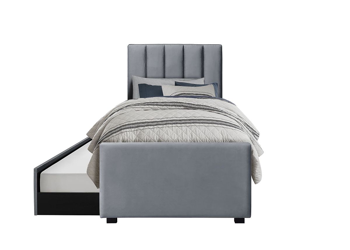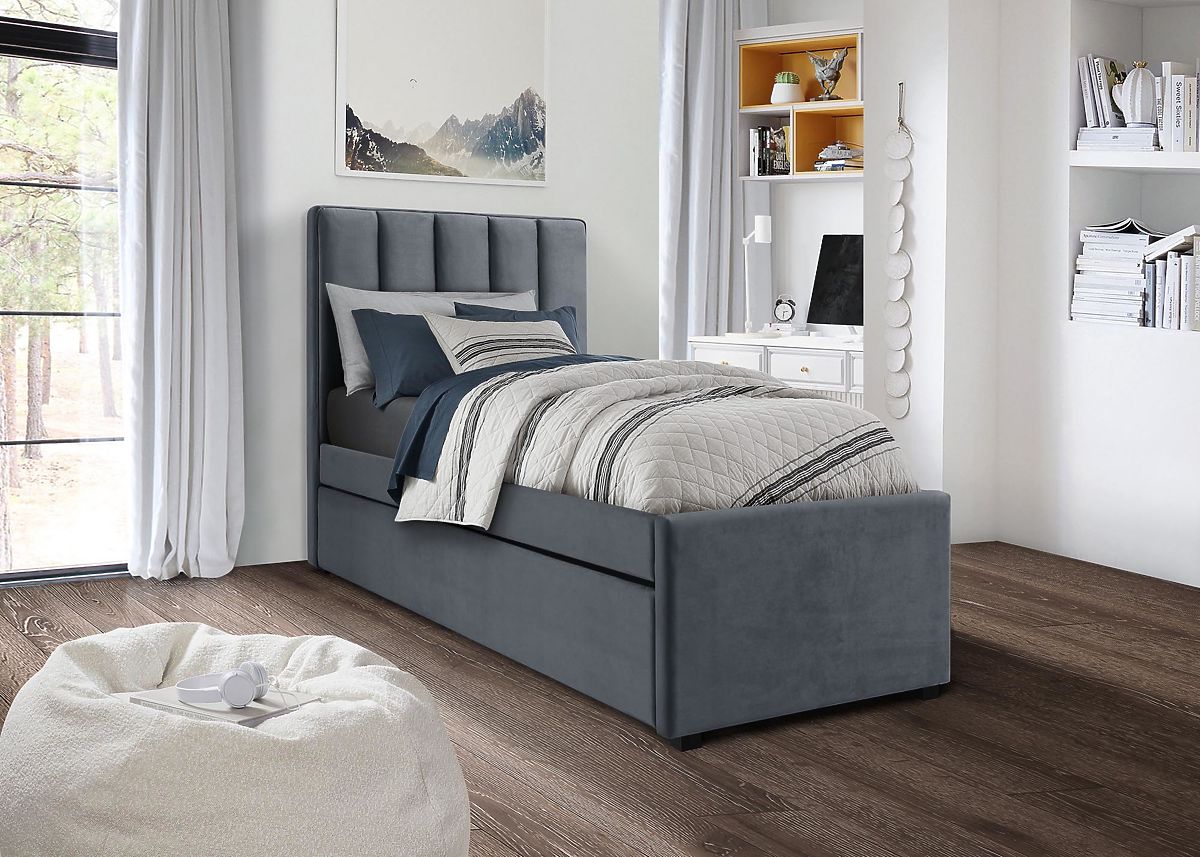 Double bed with pull-out lower mattress in grey velvet. .. more