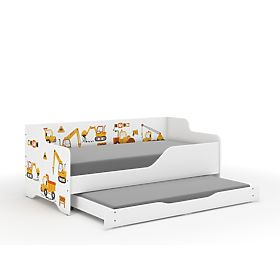 The Lilu children's bed in the shape of a sofa with a print of cars on a construction site, measuring 160 x 80 cm. This practical and very functional bed model is known as a bed with a backrest. At night, a classic bed and during the day, a comfortable sofa.