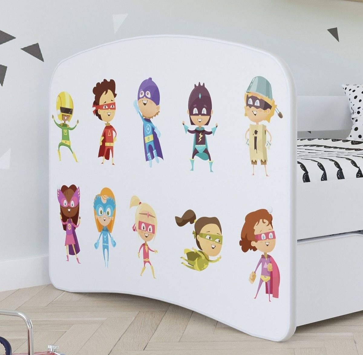 Baby bed with a picture of ten little superheroes on a white background. Each hero has an original super suit. It is only up to the child's imagination which superpowers will invent each of them. The bed is suitable for children's room for boys and girls.