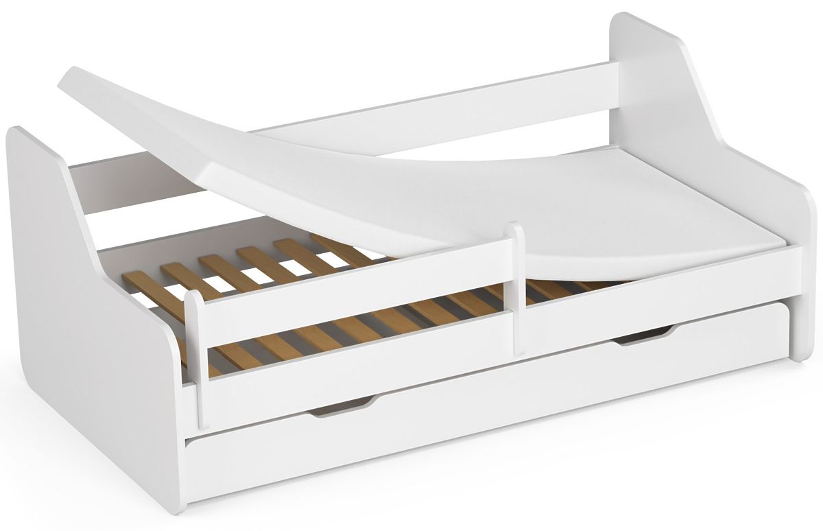 The ACTIV bed measures 160x80 cm and comes with a mattress, drawer, and guardrail. A complete bed for a boy or girl in a children's room. Color: white. The frame can support a load of up to 100 kg.