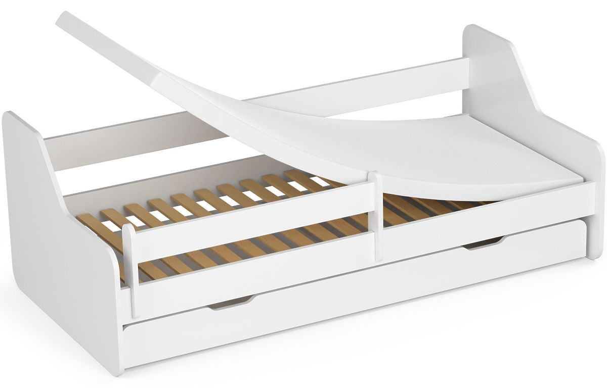 The ACTIV bed measuring 180x80 cm with a mattress, drawer, and guardrail. A complete bed for a boy or girl in the children's room. Color white. The frame can support a load of up to 100 kg.