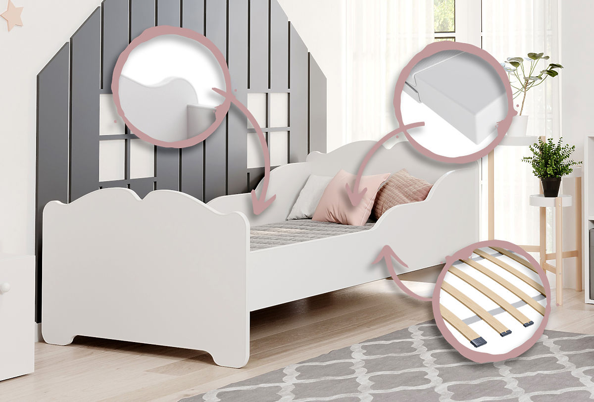 The ANNA bed is designed with the youngest users in mind, combining functionality and safety. Its sturdy construction ensures durability for years, and its careful craftsmanship eliminates sharp edges, minimizing the risk of injuries during daily activities. Sleep comfort is guaranteed by the FLEX system of flexible slats, which adapt to the child's body shape and support healthy posture during rest. The white color of the furniture adds lightness and elegance, allowing easy matching with accessories in the girl's favorite colors, such as pastel pink, lavender, or mint accents.