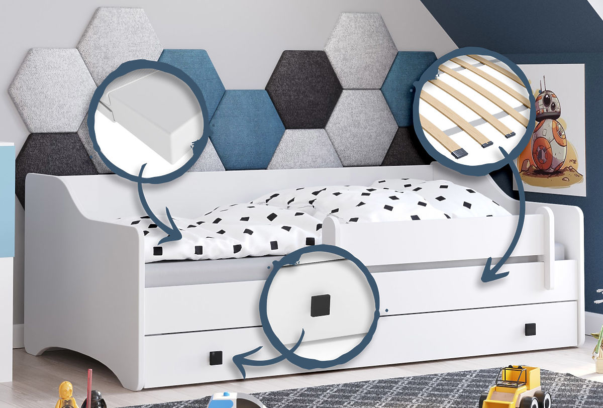 Made from high-quality furniture board, the Eryk bed guarantees strength and resistance to damage. Additionally, the natural fir wood used for the slats brings warmth and natural charm to the interior. The bed has rounded edges, minimizing the risk of injuries, and a practical drawer for bedding or toys, allowing for room tidiness. The movable guardrail provides additional protection for the child, and the FLEX slats with flexible lamellas ensure a comfortable sleep. It is the perfect choice for any parent who values safety, comfort, and aesthetics.