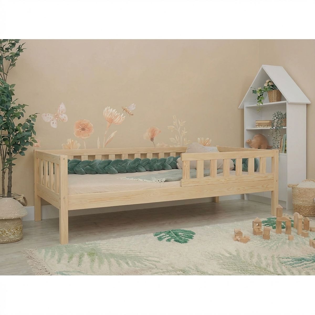 The modern Montessori Meadow children's bed in a natural design is designed according to Montessori principles, which support the independence and natural development of the child. Thanks to the structure on legs, the bed feels airy and at the same time offers the practical possibility of using the storage space under the bed. The bed provides a safe and comfortable place for sleep, rest and everyday play. The green design looks fresh and playful and will beautifully enliven any children's room.