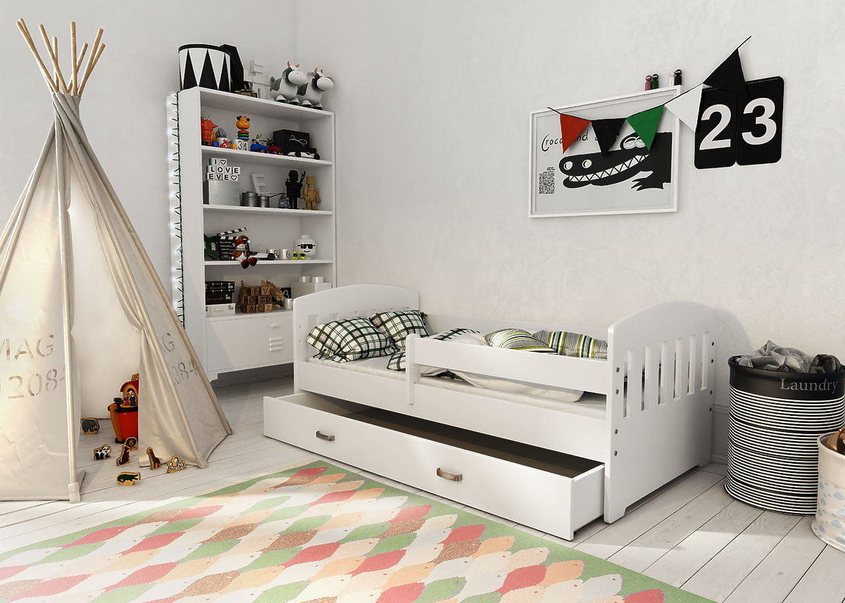 The white Niki bed with slats measuring 160 x 80 cm is crafted with the utmost care and, thanks to its universal appearance, will cozy up both girls' and boys' rooms.