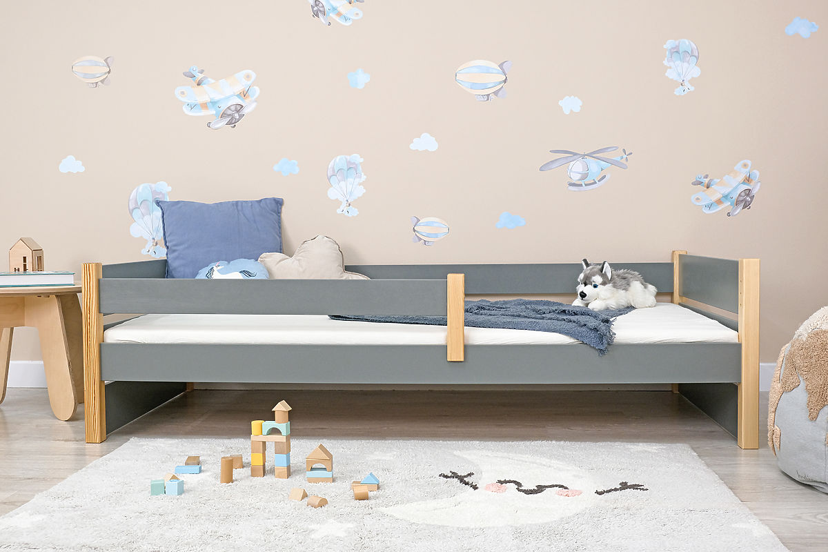 A stylish children's bed with a guardrail in an elegant combination of grey and natural colors, perfect for any child's room. The bed offers a safe and comfortable environment for play, daytime rest, and nighttime sleep. Thanks to the safety guardrail, it provides the child with protection against falling. The modern design and quality craftsmanship of the bed create a cozy and aesthetically pleasing atmosphere in the room.