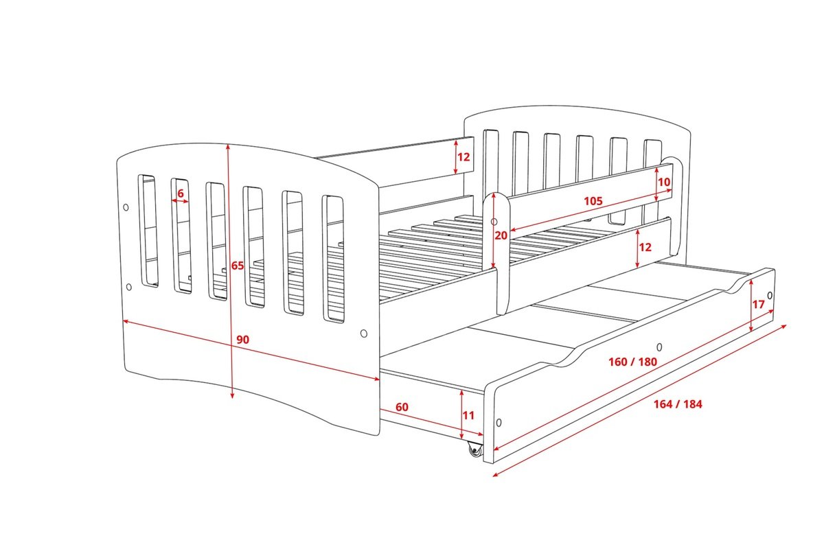 External dimensions: Bed in size 160x80cm: width - 90cm length - 165cm height - 64cm Bed in size 180x80cm: width - 90cm length - 185cm height - 64cm