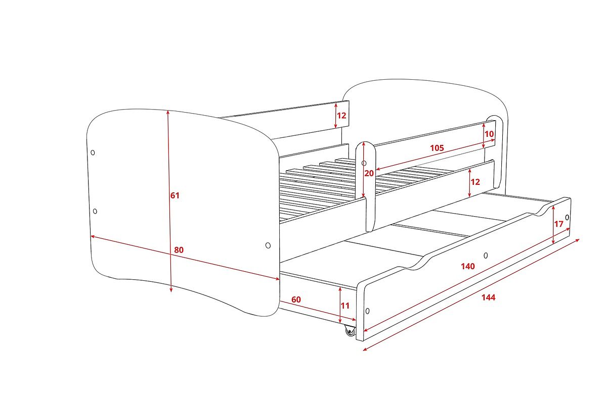 Included is a removable safety rail which can be positioned on either side of the bed. This makes the bed a variable place for sleeping as well as playing.