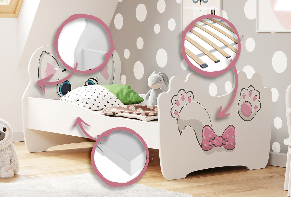 The bed is designed with the child's comfort and safety in mind, and its sturdy construction ensures stability and durability for many years. It includes a comfortable foam mattress that provides proper spinal support, promoting healthy sleep. Additionally, it features a removable cover, making it easy to maintain hygiene and cleanliness in the child's room. The FLEX slatted frame with flexible slats ensures the mattress better adapts to the child's body, enhancing sleep comfort. Attention to detail is evident in the safe construction—all edges are carefully rounded, minimizing the risk of injury. The proper height of the bed sides prevents the child from accidentally falling out during sleep, ensuring a calm and safe rest. The unique UV print is made from non-toxic, safe colors, making it resistant to abrasion, fading, and intensive use. The bed not only looks beautiful but also meets the highest standards of quality and durability.