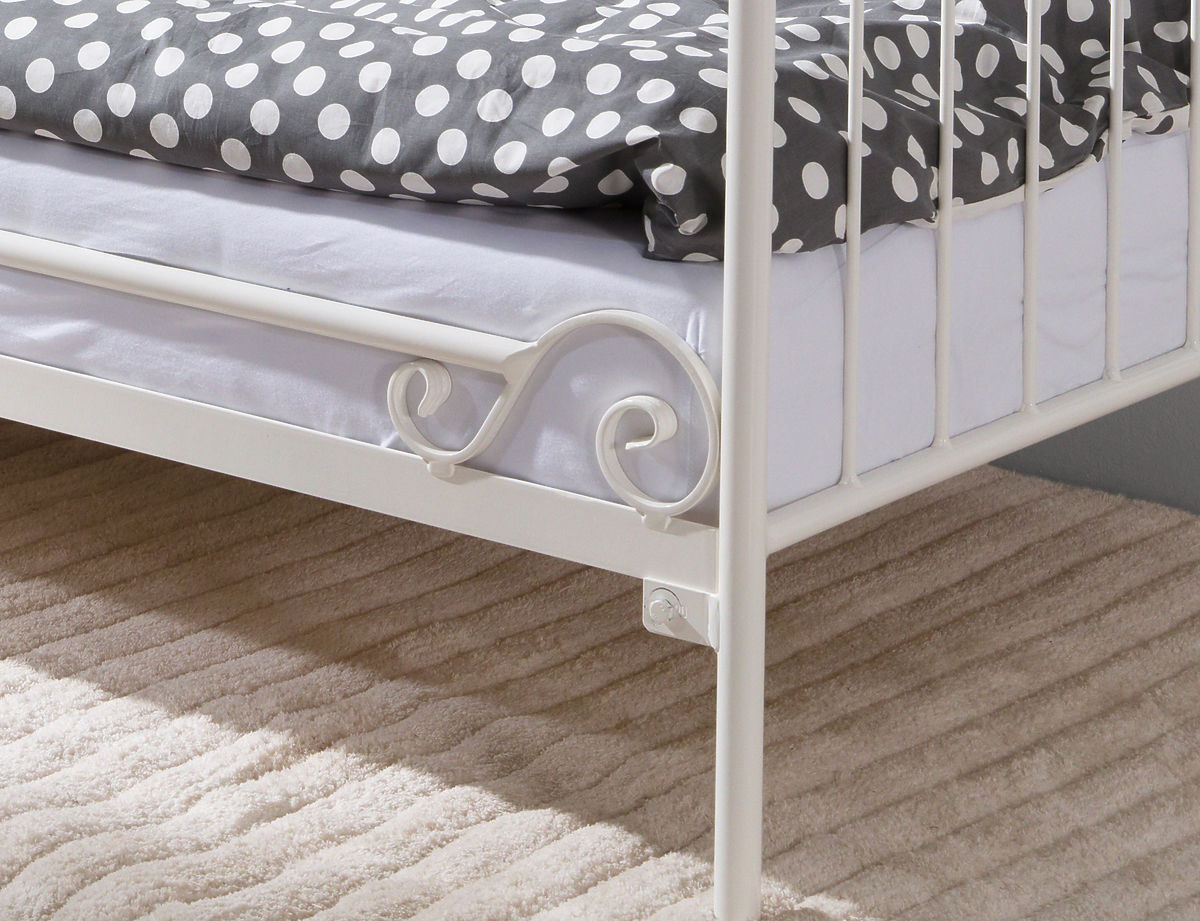 The bed is made from high-quality steel. Its metal frame comprises four parts that are joined with nuts and bolts. The structure is highly sturdy and stable. Its feet are also made of metal tubes 27 mm in diameter and the support rails are 21 mm in diameter. The metal bars are 8 mm in diameter. The bed comes with a wooden slatted bed base but the mattress is not included. It can be found in the panel on the left in the MATTRESS section, where you can select the relevant size. We recommend a 16 cm thickness.