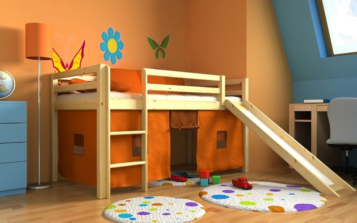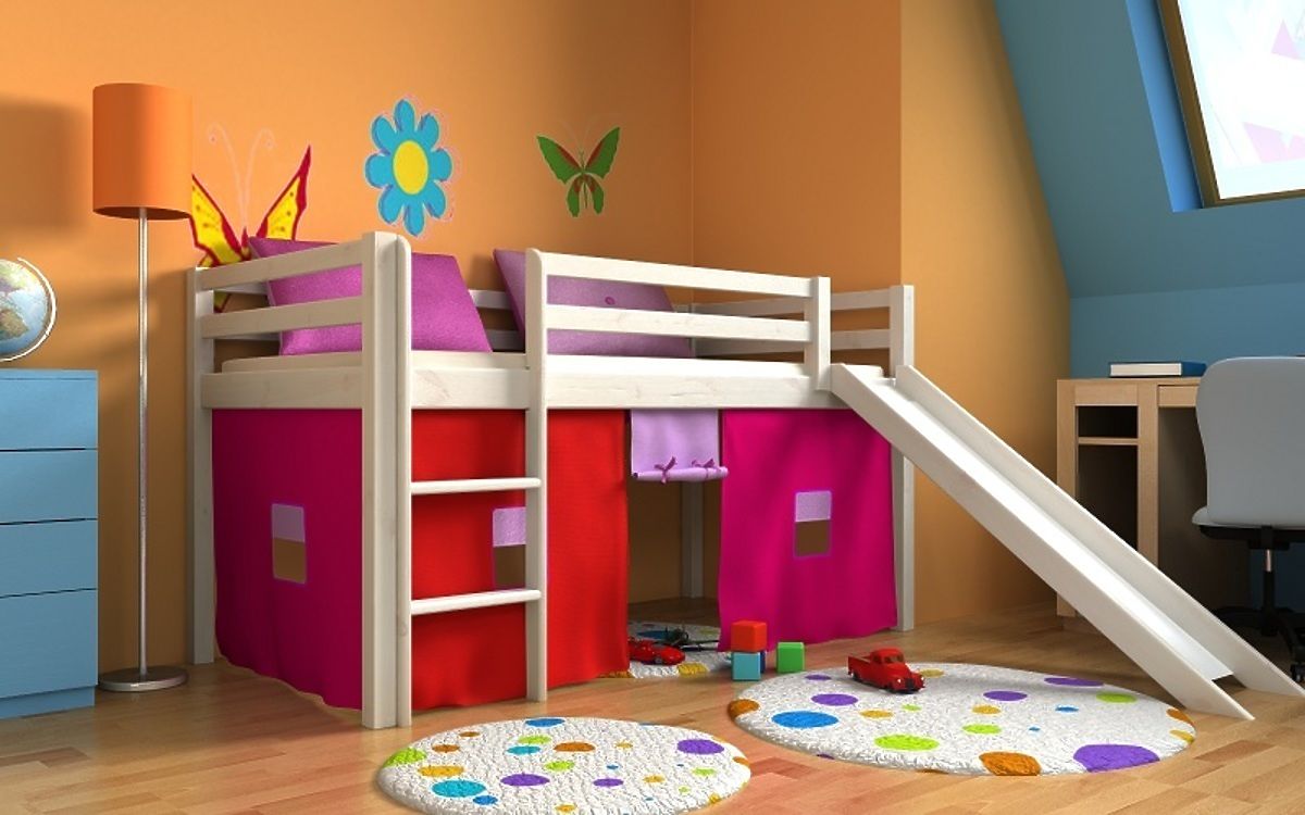 The beautiful GABI children's bed comes with a slide and fabric decorations which you can colour coordinate with your children's bedrooms. You can choose the right colour under the main photo. Apart from having a higher bed, children will also gain a space for games, a fabric playhouse and a slide, which will entertain them for hours. Being sufficiently stable and safe, it will suit all children's bedrooms, where it will save lots of space. It is made from solid pine and you can choose from an alder, pine or white finish. The bed can be cleaned with standard detergents. Thanks to using a non-toxic water-based lacquer, there is no harmful odour. Through the lacquer you can see the wood grain. The bed comes dismantled. Please state in your order the colour number you require for the fabric playhouse. The bed comes with a bed base and a mattress (180 x 80 x 10 cm).