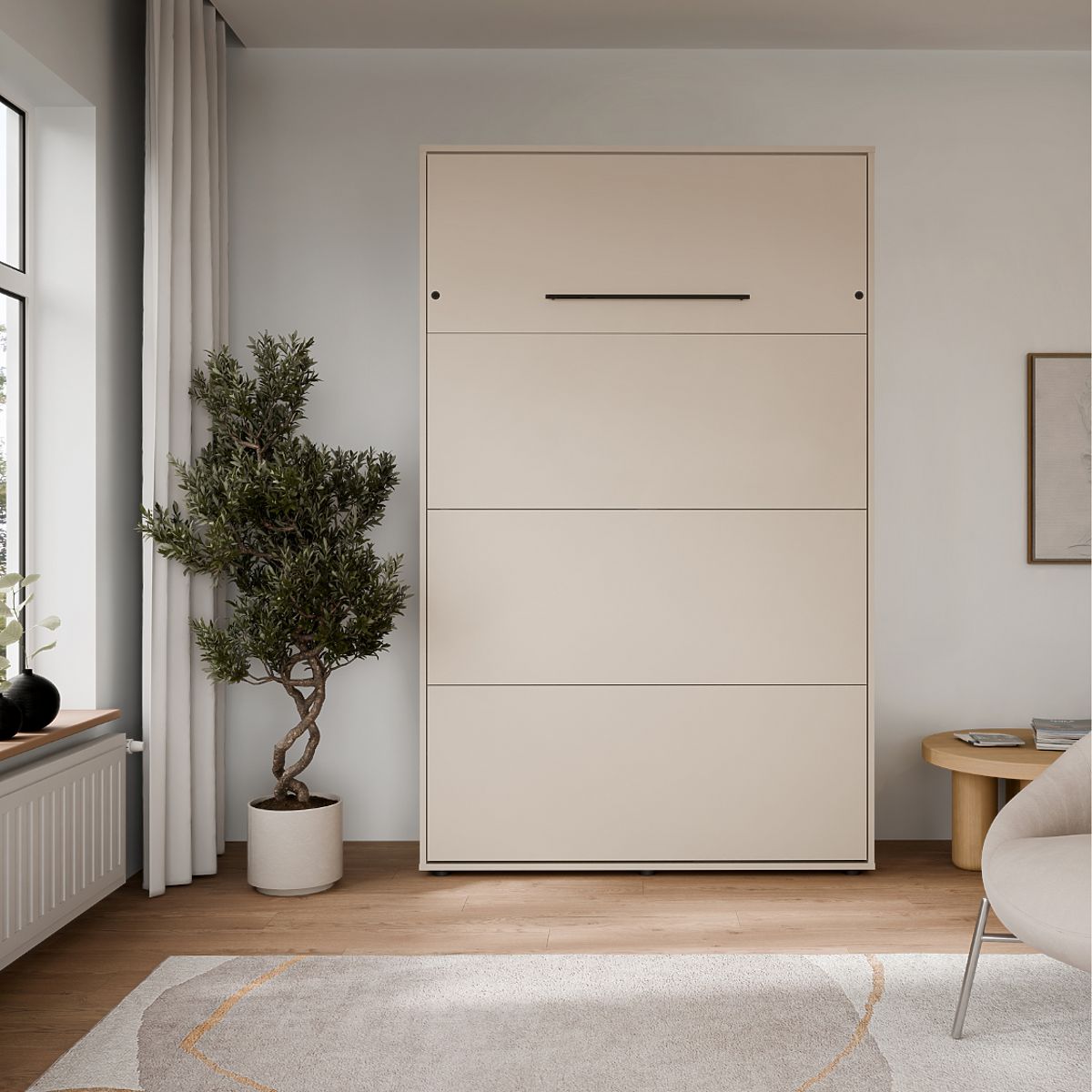 The VERTO 120x200 folding bed is an elegant, vertical bed hidden within a cabinet, allowing you to create a cozy sleeping area in a small space within moments. Perfect for those who want to combine comfort with maximum space utilization.