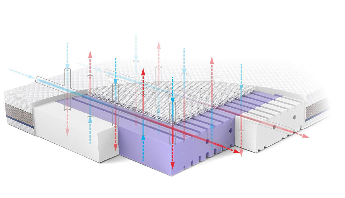 3D aeration mesh of the Air Pro system sewn around the mattressIt can be easily recognized, with us it is in gray. Its construction resembles the 3D mat described above. The main difference is that the 3D mat is 15 mm high, and the aeration mesh is 4 mm. It is important that this mesh works excellently with the vertical and horizontal ventilation channels of the Air Pro system, as it is literally connected to them. Thanks to this, unnecessary moisture, excess temperature, and CO2 are safely removed from the mattress, and access to fresh air is significantly facilitated.
