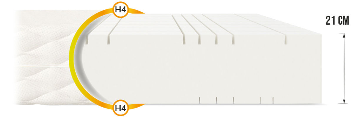 If you put quality and comfortable sleep first, the Goya Max foam mattress with a height of 21 cm will meet your requirements. The double-sided mattress is divided into 7 zones thanks to a series of longitudinal and transverse cuts. This leads to a significant increase in plasticity, which provides excellent support for the spine .