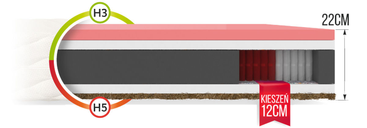 The springs are made with NanoHard technology, which guarantees strength and extends service life. The second layer is durable and flexible pur foam , which provides good body cushioning and high-quality spine support. Your body will adapt perfectly to the mattress and you will wake up rested and refreshed in the morning. Furthermore, VISCO thermoplastic foam ensures unrivaled comfort and convenience thanks to shape memory. It perfectly maps the body and later returns to its original state. To ensure additional breathability, a coconut insert was used, which, as a natural material, slightly strengthens the entire structure. A separating material was inserted between the springs and the foam. This is a natural felt that can significantly extend the life of the mattress and strengthen its construction.