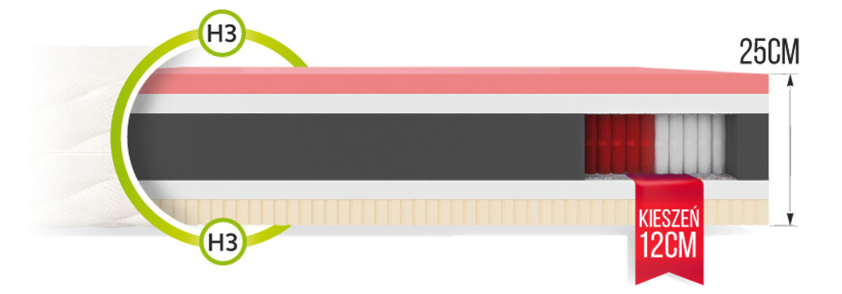 If you are looking for a comfortable two-sided mattress, COMFORT with a height of 25 cm is the right choice. The basis of this mattress with many layers is a multi-pocket insert, which has an increased number of pockets with springs . There are many more multi-pocket springs than regular pocket springs. The springs divide the mattress into 7 zones , each of which offers sufficient support for a given part of the body . Thanks to this solution, the individual springs bend individually and adapt to the body shape of the lying person. The mattress is also recommended for couples , as it reduces the discomfort resulting from the movements of the other person and thus ensures an uninterrupted deep sleep.