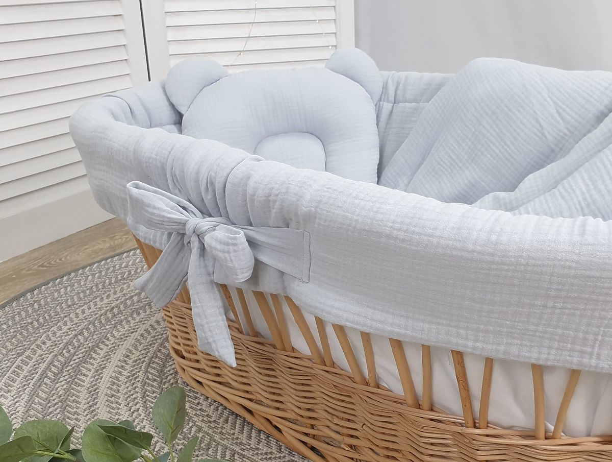 Beautiful 4-piece bedding set for a wicker crib made from soft cotton muslin. A child's skin is delicate and sensitive, which is why every parent chooses only the best for their baby. This set is the perfect choice for your little ones' sleep. The neutral grey color is suitable for both girls and boys.