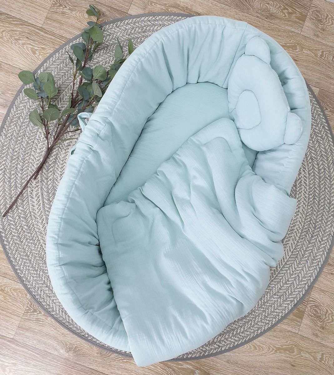 4-piece mint bedding set for wicker crib made from soft cotton muslin. .. more