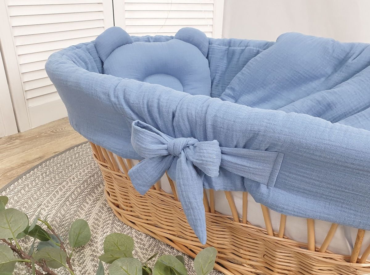 Beautiful 4-piece crib bedding set made from soft cotton muslin. A baby's skin is delicate and sensitive, which is why every parent chooses only the best for their child. This set is the perfect choice for your little ones' sleep. The beautiful blue color is suitable for all little princes.