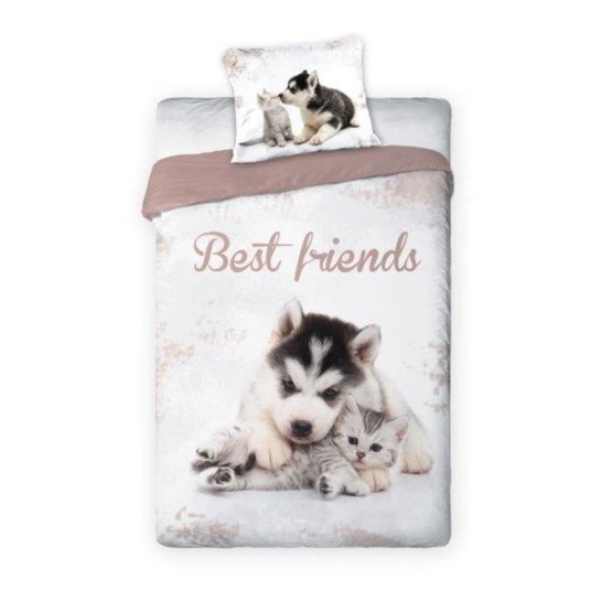 Can a dog and a cat like each other? Everything is possible with Best Friends bedding! Beautiful bedding with a pair of puppy and kitten friends is made of pleasant 100% cotton of the highest quality with an OEKO-TEX safety certificate, which guarantees a satisfied and, above all, quality and healthy sleep . A Husky puppy together with a tabby cat are a motif that children will fall in love with at first sight.