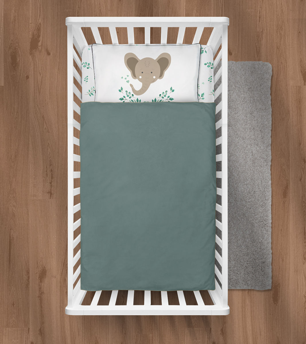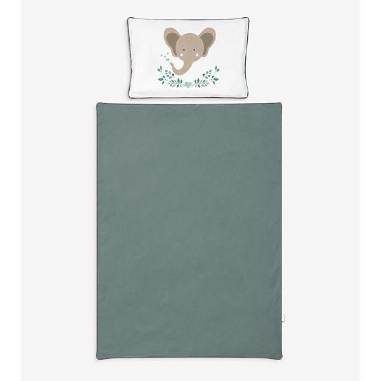 The sweetest dreams will come true in this minimalist Nature&Love Savana children's bedding with a beautiful elephant and leaf motif on the pillow, combined with a sage-colored blanket.